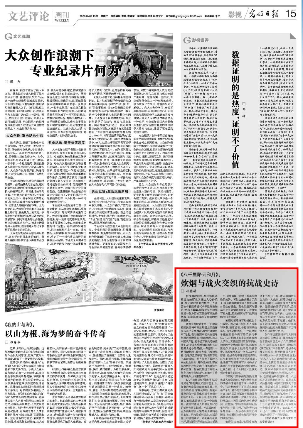 我校马克思主义学院(中共党史党建学院)孙蓓蓓博士在《光明日报》(2026年4月15日文艺评论版)发表文章《<八千里路云和月>:炊烟与战火交织的抗战史诗》。