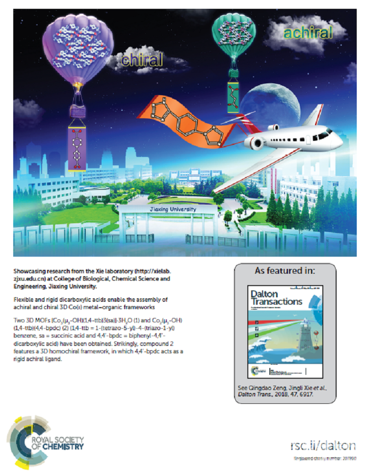 日前,生化学院谢景力课题组(http://xielab.zjxu.edu.cn)巧妙运用刚性有机配体4, 成功合成均一手性金属有机框架化合物。该研究成果的论文题目为:Flexible and rigid dicarboxylic acids enable the assembly of achiral and chiral 3D Co(II) l-organic works, 研究进展得到审稿人及编辑的积极评价, 以封底论文形式发表于RSC期刊Dalton Transactions (2018, 47, 6917-6923), 第一作者为课题组成员宫春华(现为郑州大学博士研究生)。
