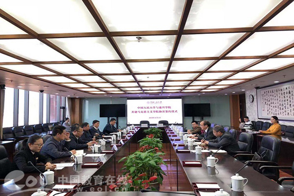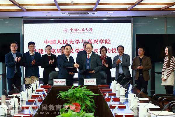 中国教育在线浙江站讯 11月1日下午,中国人民大学与嘉兴学院共建马克思主义学院签署仪式在中国人民大学举行。嘉兴学院党委书记黄文秀与中国人民大学党委副书记、纪委书记兼马克思主义学院院长吴付来分别代表双方签署协议。嘉兴学院党委副书记吕延勤,党委委员、人文社科处处长富华,以及两校有关部门负责人出席会议。中国人民大学办公室主任顾涛主持签约仪式。