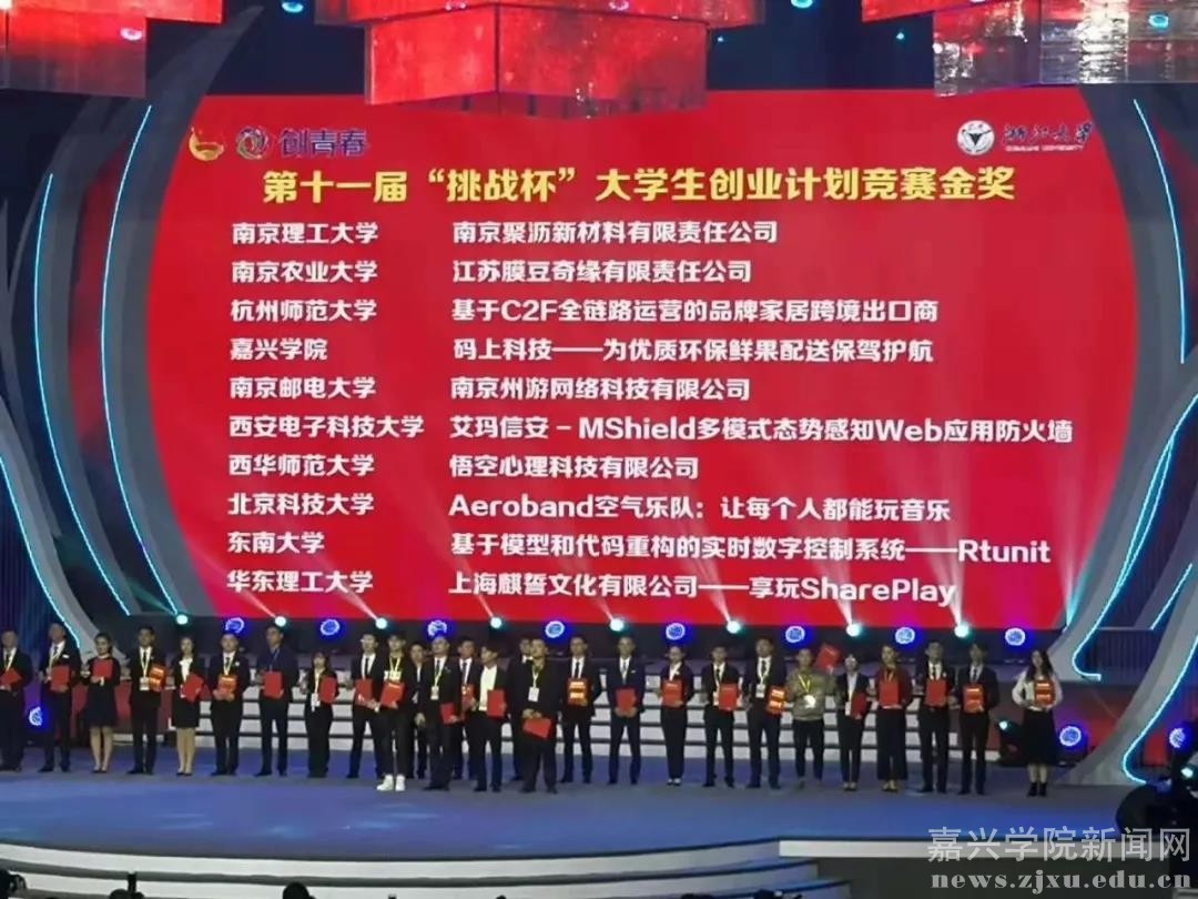 10月31日至11月3日,2018年“创青春”浙大双创杯全国大学生创业大赛在浙江大学举行。嘉兴学院《码上科技——为优质环保鲜果配送保驾护航》项目喜获全国金奖,这是嘉兴学院继2012年获“挑战杯”全国大学生创业计划竞赛金奖后,再次摘取桂冠。