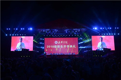 9月16日晚,嘉兴学院2018级新生开学典礼在该校越秀校区体育场举行。学校党政班子成员黄文秀、盛颂恩、严从荃、费建文、周珊、张文华、周亚新、胡俊云、柯羽、钱方明出席典礼。学校相关职能部门、各学院负责人,全体2018级新生、新生班主任、辅导员、教师和校友代表、老生及新生家长共8000余人参加了典礼。典礼由学校党委副书记严从荃主持。