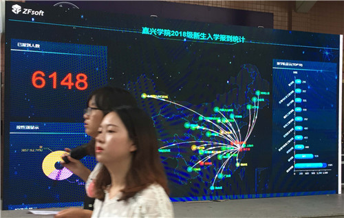 嘉兴在线9月2日讯 嘉兴学院2018级新生报到的日子。在报到现场,实时更新已报到人数等相关数据的大屏幕格外吸引眼球。