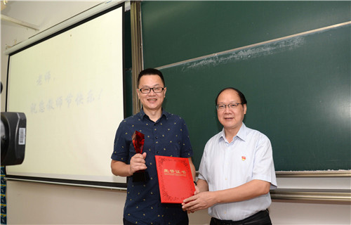 嘉兴在线9月10日讯 嘉兴学院商学院教师钱大可一如往常提前走进教室,准备开始本学期第一堂课的教学。他并不知道,这个再熟悉不过的课堂,正有一个惊喜在等着他。当钱老师从校党委书记黄文秀手中接过奖杯和学生亲手制作的礼品时,作为学校第五届“我心目中的好老师”获得者的钱老师脸上满是为人师的喜悦。