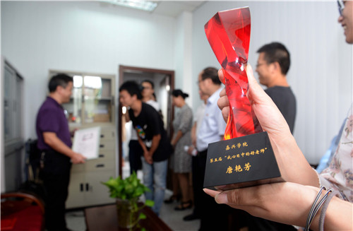 嘉兴学院每隔两年举办一次“我心目中的好老师”评选活动,今年已是第五届。但此次将颁奖典礼“搬”到教学第一线却是首次。同样是获奖者的外国语学院唐艳芳老师,在自己的办公室收到了这份别样的教师节礼物。唐老师因其学识广博、授课风趣而备受学生喜欢,被学生们赞为中外文化的“摆渡者”。“教师的工作有平凡的一面,教书育人是我们的职责所在,但同时教师的工作也有不平凡的一面,事关每一位学生的成长成才,必须慎重以待、恪尽职守。这样的颁奖形式很‘走心’,从自己的学生手中接过奖杯和纪念品,听到学生们真实的评价,更显这个奖项的珍贵。”