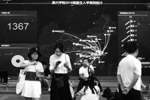 左图:“大数据”迎新——在报到现场外,一块电子大屏幕上显示着实时报到人数、各专业报到进度、生源地、男女比例等,大数据一目了然。据了解,这是嘉兴学院自主研发的报到迎新系统第一次投入使用,新生在家中就通过APP、微信、网站等通道完成入校前的自助办理,到达报到现场后扫码即可完成报到,大大提高了效率。