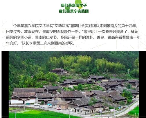 7月30日前后,嘉兴学院文法学院的志愿者们继2005年后第十四次来到丽水景南,开展暑期社会实践活动。今年,志愿者们以“文助法援,助力景南民生”为主题,结合景南乡民生发展的重点关心问题,针对性开展了支教、支农、政策宣传和法律咨询帮扶等活动。