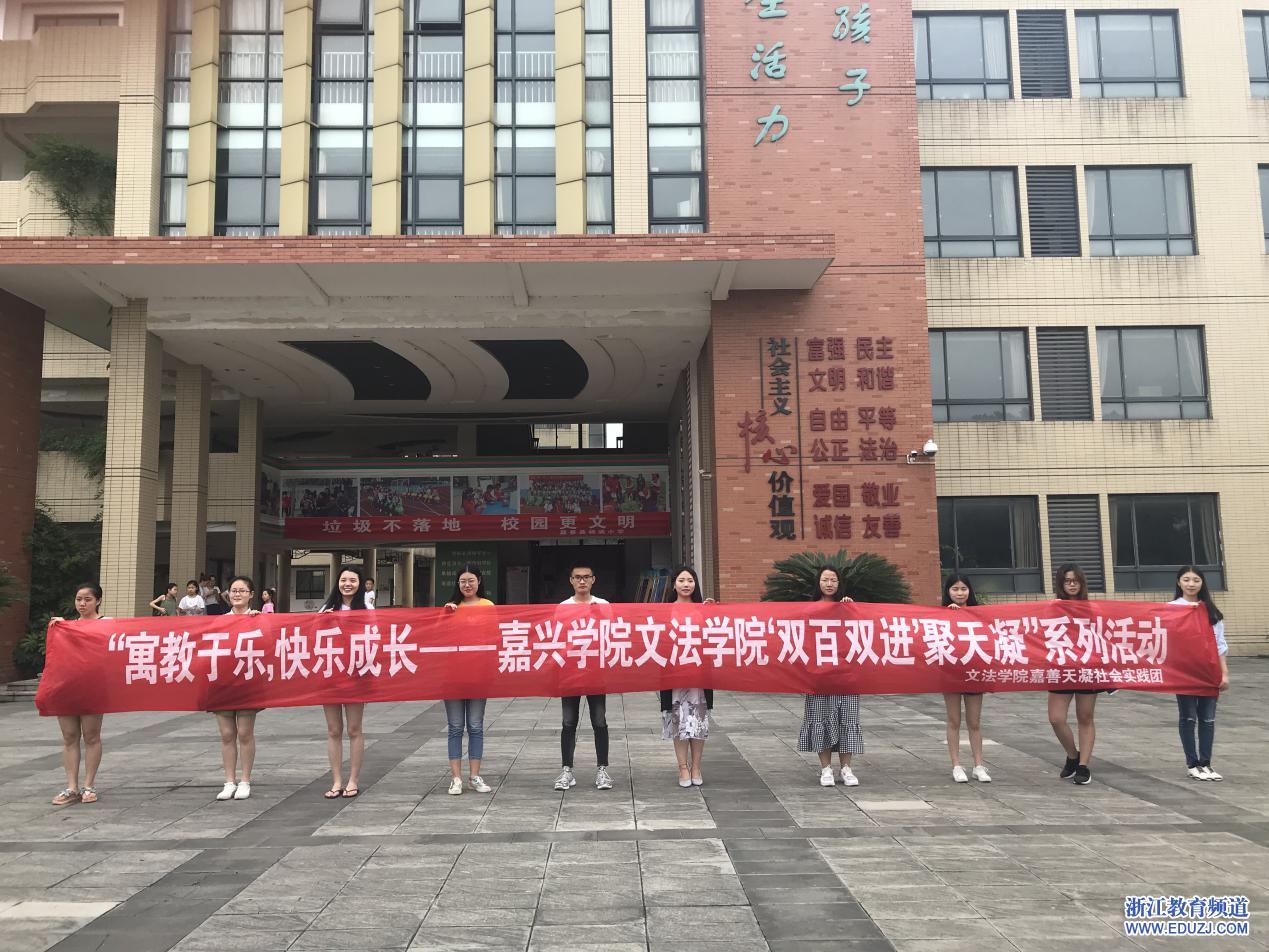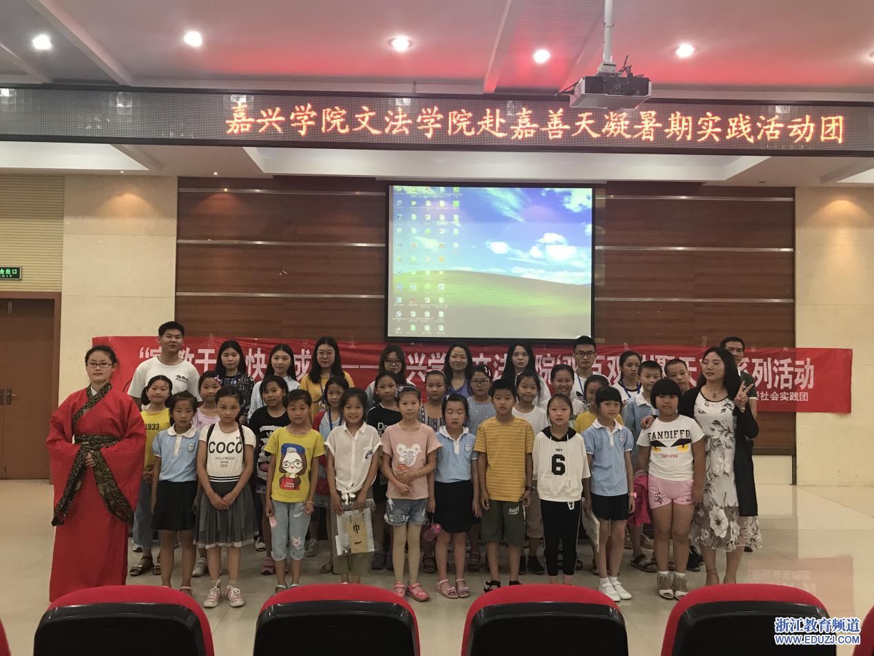 7月7日上午,嘉兴学院文法学院“双百双进”暑期社会实践团的同学们在嘉善天凝镇的杨庙小学开启了主题为“寓教于乐,快乐成长——国学下基层”活动。活动中,嘉兴学院中文系的志愿者们给大家开设了软笔书法课堂与汉服课堂,向同学们普及了中国传统文化知识。这是志愿者与嘉善天凝镇团委共同对接承办的活动,共分“知书”、“知礼”两个环节。过程中,还设置了汉字游戏,孩子们参与了“找错字”的游戏环节。