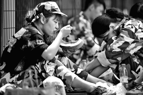 时下,禾城进入高温天气。日前,在嘉兴学院操场,学生在火辣辣的太阳下军训,休息间隙,吃西瓜解暑。