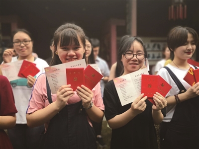 “七一”前夕,浙江师范大学法政学院组织21名新党员在衢州江山毛氏清漾文化村举行入党宣誓仪式。图为新党员拿到鲜红的党章和学院特制记录党员入党信息的纪念卡。