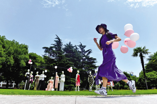 昨天中午,一场别开生面的服饰文化展在嘉兴学院越秀校区大草坪展开,立体剪裁的服饰和蓝天绿树相映成趣,工业设计作品挂在画架上有腔调地展示……这个名为《集》的别致展览倾情展现了南湖学院化纺系同学们的创造力和无敌青春。 ■摄影 记者 李剑铭