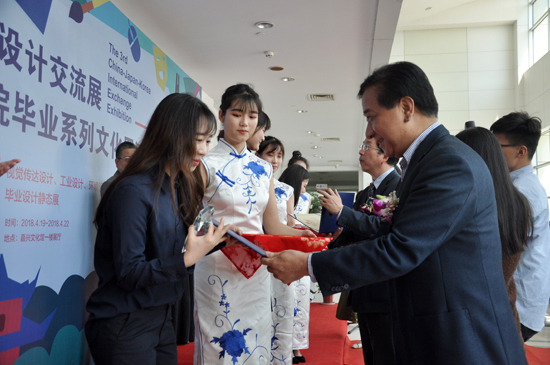 嘉兴在线4月19日讯“北大青鸟杯”第三届中日韩高校师生艺术设计作品联展暨嘉兴学院设计学院2018系列文化展演活动今天上午在嘉兴市文化馆正式启动。市领导刘冬升、柴永强,嘉兴学院、北大青鸟集团、日本东亚大学、韩国白石大学等有关领导及师生代表出席开幕式,并参观了同时举办的静态作品展。嘉兴学院设计学院300余件2018毕业设计作品及来自中、日、韩三国高校艺术师生的一百多件参赛作品在此次静态作品展中展出。