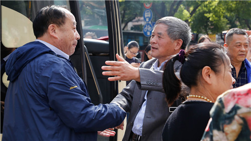 “年轻的朋友们,今天来相会。荡起小船儿,晚风轻轻吹。花儿香,鸟儿鸣,春光惹人醉,欢歌笑语绕着彩云飞。”18日上午9点,部分居住在嘉兴本地的老校友们便早早来到嘉兴学院东门等候。不多时,载着工业会计7627班其他校友的客车缓缓驶来。车还未停,车上难掩激动的校友们已兴奋地将脸贴在车窗上与老友们招手,有甚者一跃起身挥舞着双臂。记忆中那些漂亮的小姑娘和英俊的小伙子,如今都变成了面带风霜、银丝缠头的老年人。纵然已迈过花甲之年,但他们仍精神矍铄。年少时的伙伴跨越了山川湖海来到浙江求学,41年后终于得以再次相见。车停下来了,人群中有人不停呼喊,有人握手言欢,有人紧紧相拥,“是谁的手突然收回,紧紧捂住自己的眼睛,当人们四散离去。”