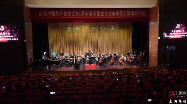 在中国共产党成立96周年之际,7月1日晚,庆祝中国共产党成立96周年˙满天星业余交响乐团公益演出在嘉兴学院梁林校区小剧场举行。嘉兴市政协主席高玲慧,嘉兴市委常委、组织部长连小敏以及嘉兴学院党委书记黄文秀,校长盛颂恩,党委副书记吕延勤出席并观看演出。800余名师生到场一起共享了这场极富感染力的音乐盛宴。