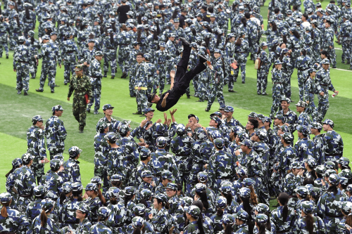 昨天,嘉兴学院举行2015级5400余名学生军训阅兵仪式,在过去的10天中,同学们经历了风吹日晒雨淋,学会了团结感恩互助,从身体到精神都得到了极大的磨炼,留下了大学生涯难忘的记忆。仪式结束后,同学们将教官高高抛起,表达喜悦和感恩之情。