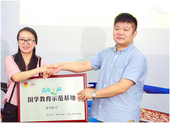 团中央“青年之声”国学教育联盟副主席于钟华为嘉兴学院“‘青年之声’国学教育示范基地”授牌,嘉兴学院团委副书记张婧源女士接受牌匾。