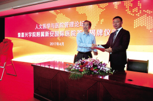 2017年4月21日,在浙江新安国际医院开业八周年的日子里,嘉兴学院附属新安国际医院签约揭牌仪式隆重举行。嘉兴学院院长盛颂恩、嘉兴市卫计委副主任王国芬、秀洲区副区长帅朝晖、秀洲区卫生和计划生育局局长孙庆华等出席签约揭牌仪式。这意味着,浙江新安国际医院正式成为嘉兴学院附属医院,双方因“医”结缘,将在人才培养、医学研究、医疗协作等方面进行深入合作,必将为嘉兴地区的医疗卫生事业发展作出新的更大的贡献。