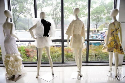 昨天,嘉兴学院越秀校区一幢教学楼中,身着时装的模特迎接着同学们。这些时装是由服装专业的学生设计的,在展示学业成绩的同时,也装饰了校园。
