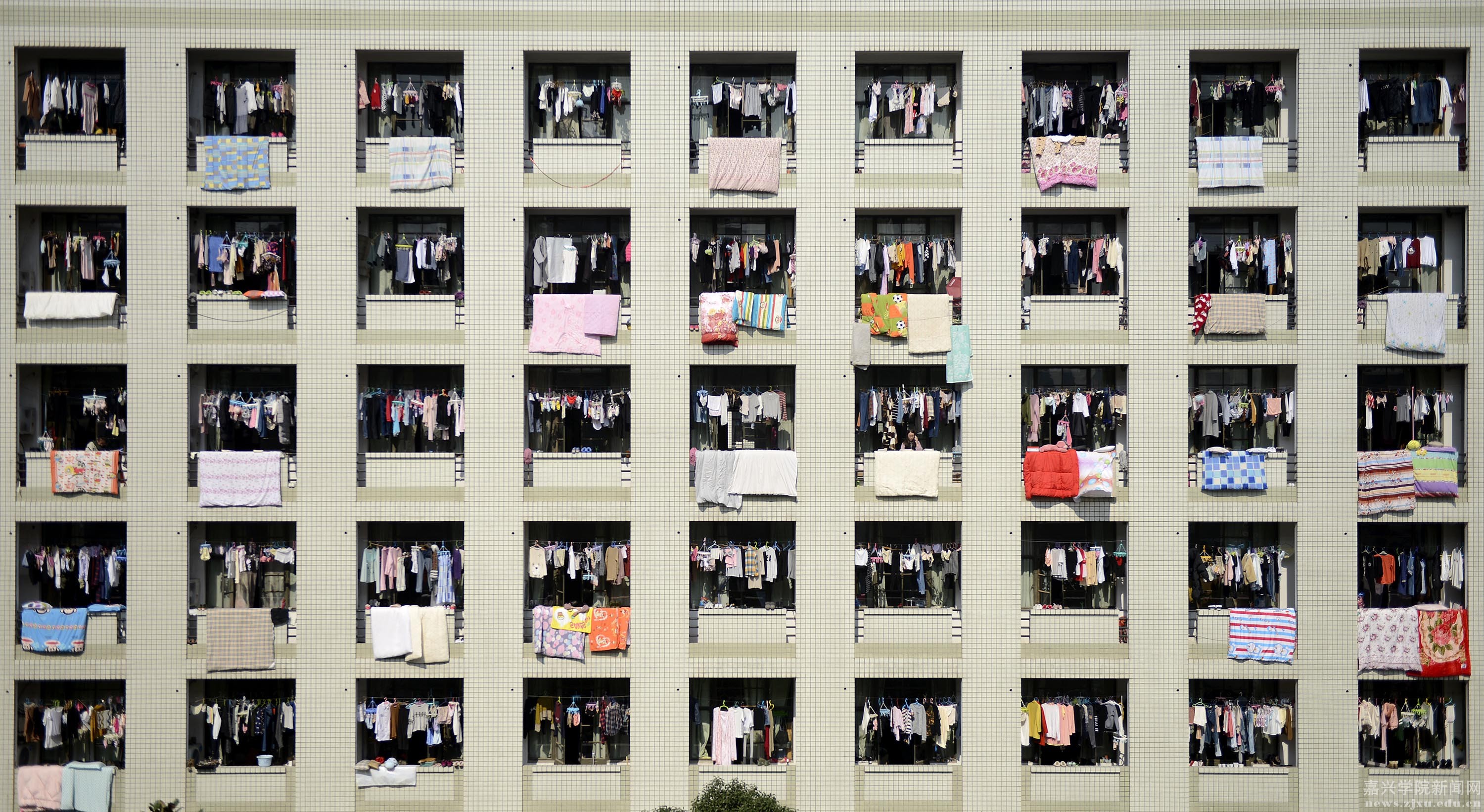 昨天,深秋的禾城出现暖阳,嘉兴学院南湖学院寝室楼阳台上、寝室楼下晒满了被褥、衣服。