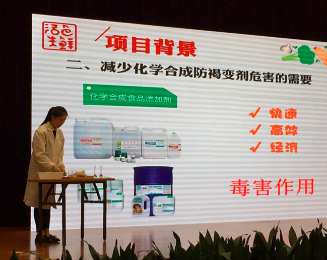 化学添加剂、天然添加剂、不放添加剂,这三种状态下的水果表面会发生什么变化?浙江师范大学“天然果蔬防褐变剂”项目用现场实验展示了产品的安全性。因为实验成果与日常生活息息相关,评委就实际生产方面提出了不少问题。中国孩子从小就经受了各种化学添加剂的“考验”,浙师大项目团队打出的纯天然口号可以说是深得“民心”。