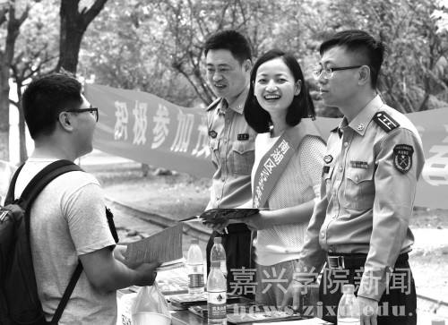昨天上午,南湖区征兵宣传形象大使康梦琦(中)和该区人武干部一起,走进嘉兴学院宣传征兵政策。