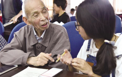 当天下午2点,微信培训班正式开始,100位老人、50名大学生志愿者交错有序地落座。记者观察发现,这些老人大多从来没有玩过微信,但都有一颗“潮”前看的心。