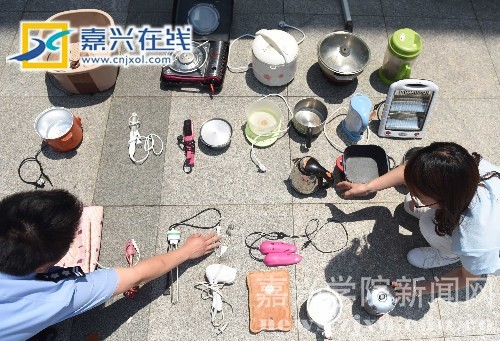 昨天中午,嘉兴学院越秀校区广场上,学校保卫科和宿舍管理部门将违章使用的小家电进行展示,在全国防灾减灾日里提醒同学们安全无小事。