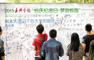 昨天上午,校友们在嘉兴学院校庆纪念日梦游校园签名墙上签下了各自的名字。当天是嘉兴学院首个校庆纪念日,来自全国各地的600余名校友纷纷返校。学校举行了校庆日启动仪式,并组织安排了“校园游园”“体育联谊”“舌尖上的母校”“校友书画摄影作品展”等系列活动。
