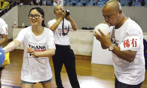 6月13日上午,嘉兴学院越秀校区体育馆里笑声朗朗,一场别开生面的趣味运动会召集了全市各地的100多名无偿献血者,他们每个人的臂膀上都贴了血型牌,分成小组开展各种趣味运动项目。