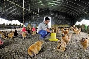昨天,在海盐县百步镇逍恬村,嘉兴学院毕业生胡喜锋在鸡棚里照顾他的中华宫廷黄鸡。胡喜锋是嘉兴人,2001年从嘉兴学院毕业后从事电子商务工作,并且钟爱养殖业。2004年,他辞职后在百步镇承包了180亩土地,养鸡、养鱼、种水果等,当起了农场主。“我看重的不是农产品的产量,而是品质。再通过网络交易,农产品肯定不愁销路。”胡喜锋说。