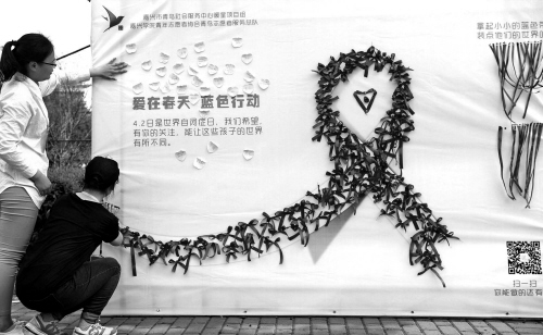 昨天,嘉兴市青鸟社会服务中心暖星项目组和大学生志愿者在嘉兴学院梁林校区开展“爱在春天,蓝色行动”的活动,呼吁全社会都来关注“星星的孩子”自闭症儿童。