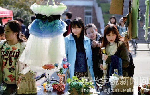昨天,在嘉兴学院梁林校区,“心·绿节能环保协会”将同学们用废弃物制作的艺术品展示出来,一件由一次性桌布制作的晚礼服让人眼前一亮。环保协会还邀请同学们用废弃物置换小礼物,唤起大家对废弃物回收再利用的重视,倡导环境保护。