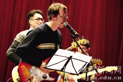 12月19日晚,在嘉兴学院越秀校区,学校外语翻译社的同学们为外教彼得举办了一场充满欢乐气氛的演唱会,一起迎接即将到来的圣诞节。据了解,彼得在嘉兴做外教已经3年了,是一个音乐迷,自己还写了许多原创歌曲,深受学生喜爱。