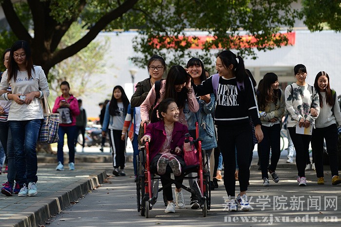 去年9月,佳莹以高考理科506分的成绩进入嘉兴学院南湖学院工商管理系。能够和其他孩子一样进入大学,接受高等教育,本该是件喜事,但对佳莹和家人来说却有些喜忧参半——偌大的校园,分布在学校各处的教室、寝室和食堂,佳莹身体上的不便应该如何克服?没想到,这个难题很快就被解决了——班里的同学们专门成立了“轮椅小分队”,以寝室为单位,每周轮流照顾佳莹。校门口、宿舍楼、教学楼……“轮椅小分队”的队员们陪伴佳莹的身影随处可见。一年多时间里,陆续有10多个宿舍同学给予了佳莹悉心的照顾和帮助。