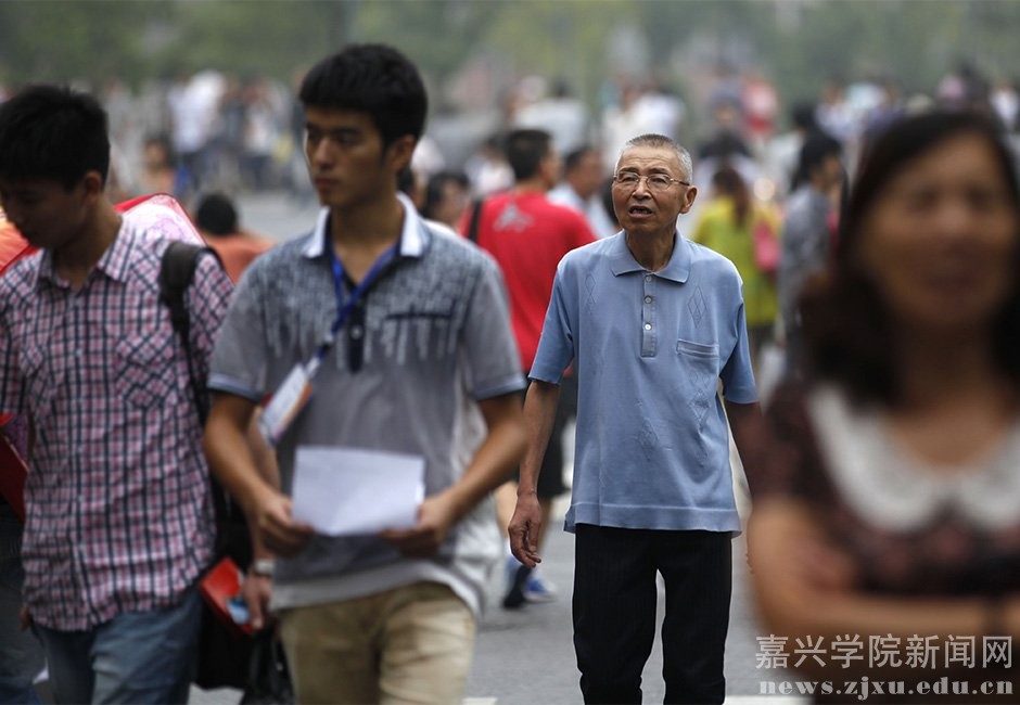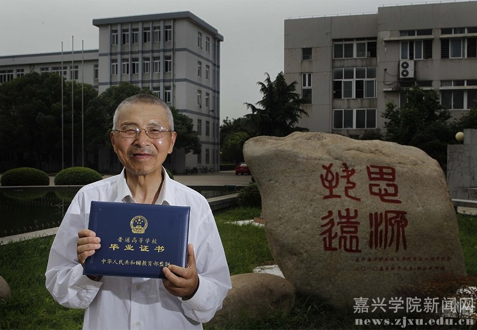 身穿学士服的邹伟敏和比他小50多岁的同班同学一起漫步在校园。2003年以来,他6次参加全国统一高考,屡屡落第又屡屡复考而成为嘉兴的高考名人。一直到2008年,他终于考上了嘉兴南洋职业技术学院。