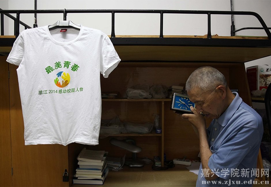 邹伟敏的这件蓝色短袖已经穿了好多年了。他手里的这块老钟表 ,也是个上了岁数的物件。他的床头挂了一件印有“最美青春”的纪念衫,这是他获得“浙江2014感到校园人物”时组委会给的。