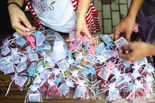 何志雄将水果包装在小礼物袋中,贴上自己微店的二维码。