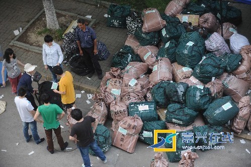 昨天下午,嘉兴学院越秀校区中国邮政包裹受理点里,大学毕业生们托运的包裹堆成了“小山”,这几天,仅这一处受理点日平均托运量都超过了200件。