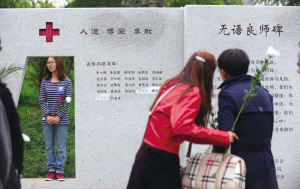 昨天上午,“无语良师”纪念碑祭扫活动在嘉兴学院医学院开展,一对姐妹在纪念碑前寻找捐献遗体的母亲名字。活动现场,遗体捐献者家属、嘉兴学院学生代表等近百人参加了活动,表达对捐献者无尽的思念和崇高的敬意。