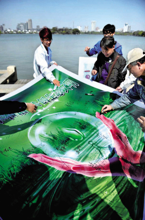 昨天上午,南湖会景园,来自嘉兴学院生化学院的志愿者们在南湖畔向游客宣传“五水共治”,并邀请游客在宣传画幅上签字,希望大家文明游南湖,共同保护南湖水质。当天正值“世界水日”。