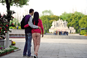 3月28日,一对恋人走进英雄园。英烈雕像下,几十名嘉兴学院的大学生正在缅怀先烈,祭扫献花。