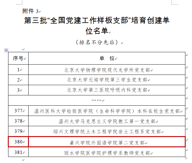 近日,教育部办公厅公布第三批全国党建工作示范高校、标杆院系、样板支部培育创建单位名单,嘉兴学院外国语学院第二党支部入选第三批“全国党建工作样板支部”培育创建单位。