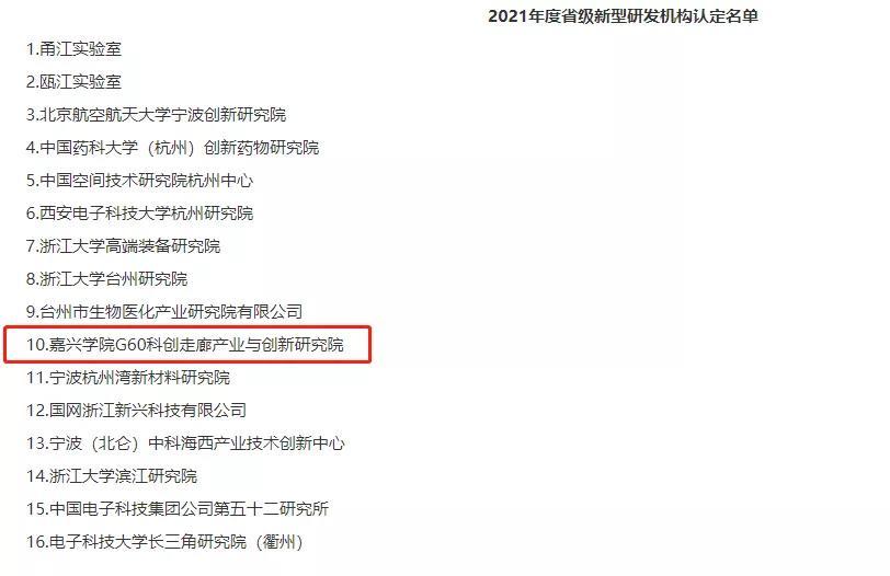 “嘉兴学院G60科创走廊产业与创新研究院”是由该校与嘉兴经济技术开发区管委会共建的新型研发机构。作为学校建设一流应用型高校的重要支撑,研究院主要面向浙江省着力打造的“互联网+”、生命健康、新材料三大科创高地,聚焦数字健康、智慧交通、纳米新材料等民生领域开展技术研究和产业化成果转化,为区域经济发展提供科技创新驱动力和科技服务支撑。