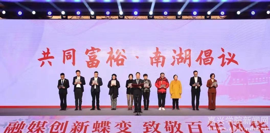 嘉兴学院党委书记、嘉兴学院中国共同富裕研究院院长卢新波,“感动中国”人物、全国优秀共产党员、全国自强模范朱丽华,南湖晚报嘉禾绿荫行动爱心团队代表,嘉兴的海宁丁桥镇、海盐通元镇、平湖林埭镇、嘉善西塘镇、秀洲洪合镇5个共富乡镇的基层代表,以及全国晚报媒体代表共同宣读《共同富裕·南湖倡议》。