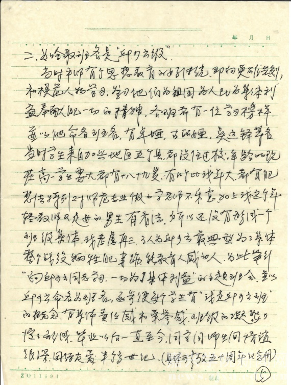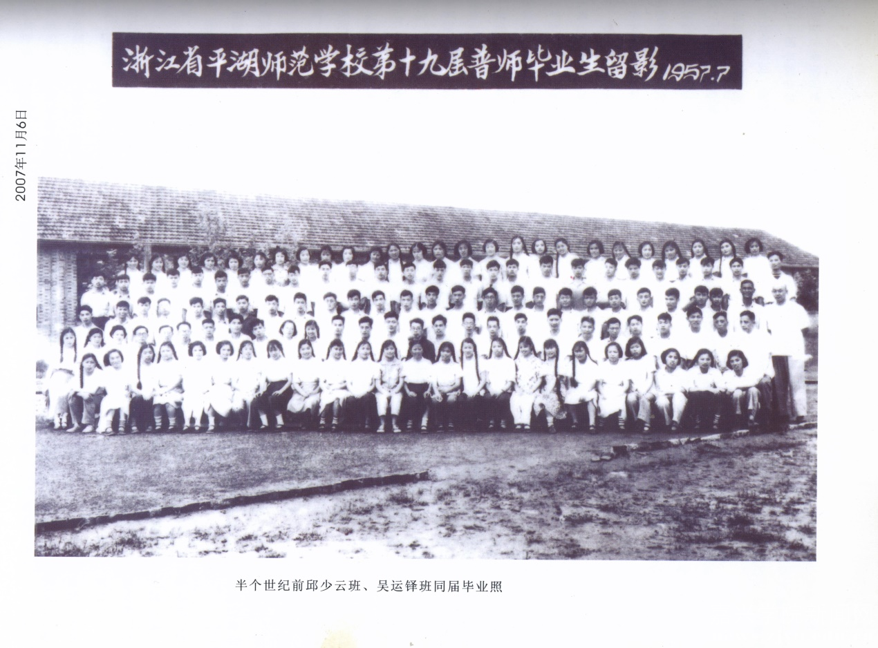 谈到这面保存了六十多年、白绸已经泛出黄色的班旗,吕老师说,当时(上个世纪五十年代中期)平师有个做法,就是学生班级以心目中英雄和先进模范人物的名字命名。当时刚刚从浙江大学政治系毕业的吕瑞芝老师和班里同学年龄相仿,或仅仅大他们其中一些人一二岁,但教书育人、为人师表的强烈责任感,和认真负责、踏实肯干的工作作风,激励着她在面对全班50多个同学时,认真思考作为班主任该怎样带好这个学生班级。她常常思考如何培养良好的学风班风,凝聚起集体的力量,激励每一位同学好好学习,献身祖国的基础教育事业。经过认真思考,吕老师觉得打造一个健康活泼、富有青春活力的班集体,是班主任工作的重点和抓手。由此,她想到了抗美援朝的英雄邱少云烈士,邱少云烈士为了维护集体利益和安全,烈火焚身,一动不动,直至牺牲自己年轻的生命。邱少云烈士身上闪耀的集体主义精神,值得大家学习。而打造一个有朝气活力的班集体,集体主义精神的熏陶自然是强有力的。为此,经过讨论,全班一致同意以“邱少云班”命名自己的班级,并制作了白底红字绸缎料的班旗,绣着“邱少云班”四个鲜艳夺目的红色大字。即使经历了六十多年的岁月洗礼,“邱少云班”四个红色大字光彩依旧。全班同学以自己是邱少云班的一员,成长在“邱少云班”的班旗下而自豪骄傲。