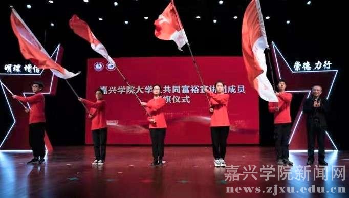 思政公开课主题宣讲后,嘉兴学院大学生共同富裕宣讲团举行成立仪式,嘉兴学院党委副书记钱方明、团浙江省委学校部副部长章豪锋、省学联执行主席郁佳俐等出席成立仪式,钱方明为嘉兴学院大学生共同富裕宣讲团成员授旗;章豪锋为宣讲团指导教师颁发聘书。