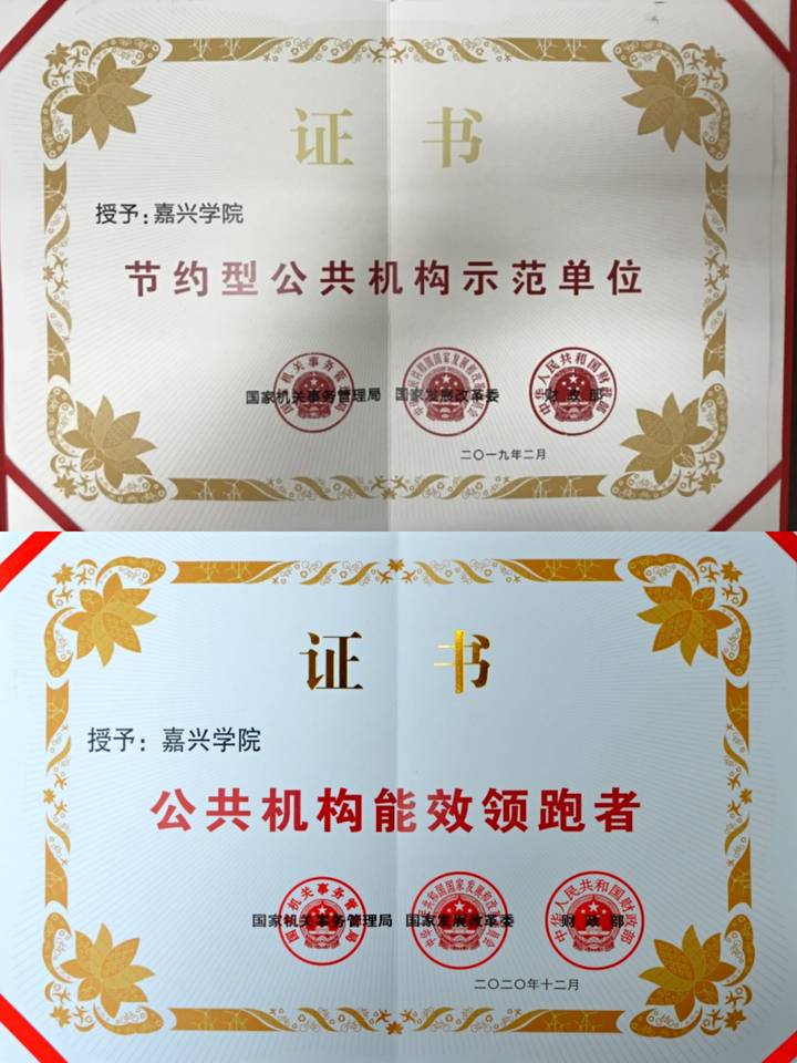 嘉兴学院节能降耗取得累累硕果。2019年,嘉兴学院被国家机关事务管理局、国家发展改革委、财政部授予“节约型公共机构示范单位”称号;嘉兴学院数据中心机房通过浙江省绿色数据中心联盟认证,被确定为二星级绿色数据中心。2020年,嘉兴学院通过能源管理体系认证审核,被国家机关事务管理局、国家发展改革委、财政部授予“公共机构能效领跑者”称号,被浙江省水利厅等7部门授予浙江省节水标杆单位称号。