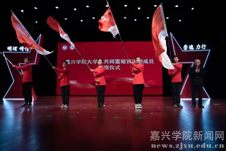 成立仪式上,嘉兴学院党委副书记钱方明为嘉兴学院大学生共同富裕宣讲团成员授旗。