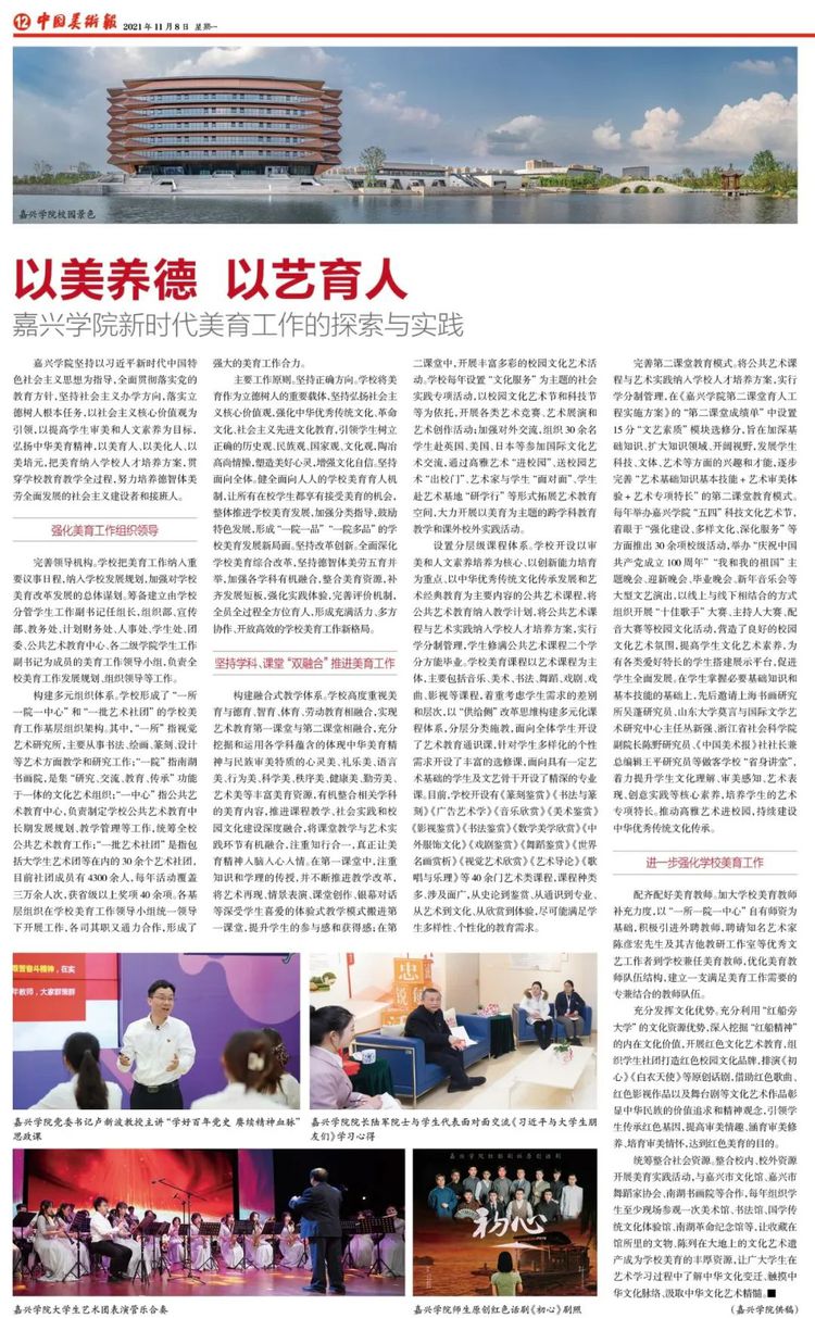 完善第二课堂教育模式。将公共艺术课程与艺术实践纳入学校人才培养方案,实行学分制管理,在《嘉兴学院第二课堂育人工程实施方案》的“第二课堂成绩单”中设置15分“文艺素质”模块选修分,旨在加深基础知识、扩大知识领域、开阔视野,发展学生科技、文体、艺术等方面的兴趣和才能,逐步完善“艺术基础知识基本技能+艺术审美体验+艺术专项特长”的第二课堂教育模式。每年举办嘉兴学院“五四”科技文化艺术节,着眼于“强化建设、多样文化、深化服务”等方面推出30余项校级活动,举办“庆祝中国共产党成立100周年”“我和我的祖国”主题晚会、迎新晚会、毕业晚会、新年音乐会等大型文艺演出,以线上与线下相结合的方式组织开展“十佳歌手”大赛、主持人大赛、配音大赛等校园文化活动,营造了良好的校园文化艺术氛围,提高学生文化艺术素养,为有各类爱好特长的学生搭建展示平台,促进学生全面发展。在学生掌握必要基础知识和基本技能的基础上,先后邀请上海书画研究所吴蓬研究员、山东大学莫言与国际文学艺术研究中心主任丛新强、浙江省社会科学院副院长陈野研究员、《中国美术报》社社长兼总编辑王平研究员等做客学校“省身讲堂”,着力提升学生文化理解、审美感知、艺术表现、创意实践等核心素养,培养学生的艺术专项特长。推动高雅艺术进校园,持续建设中华优秀传统文化传承。
