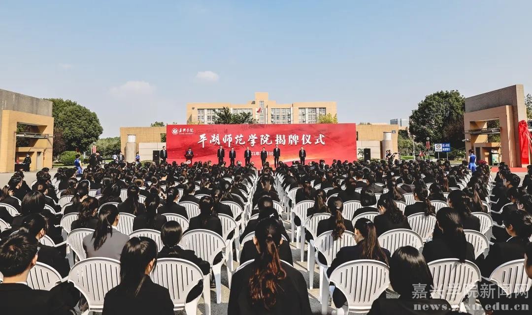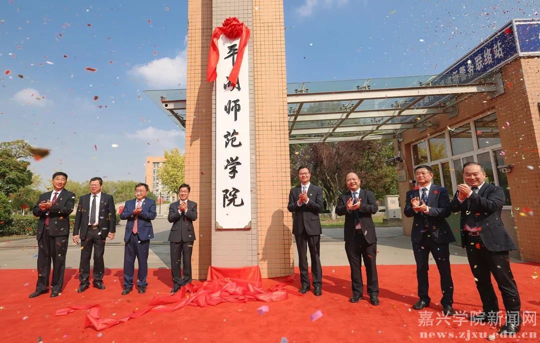 仪式上,嘉兴学院党委书记卢新波、平湖市委书记祁海龙等为平湖师范学院揭牌。