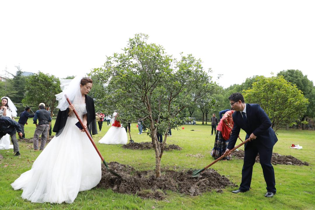 此次集体婚礼还安排了新人一起种下“新婚纪念树”等温馨环节,同时采取线下活动和线上图文直播的方式进行。